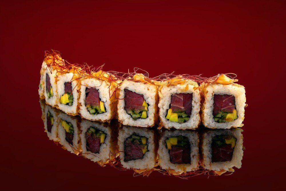 Рис для суши, тунец, огурец, авокадо, стружка тунца, соус спайси, нити перца наиру
