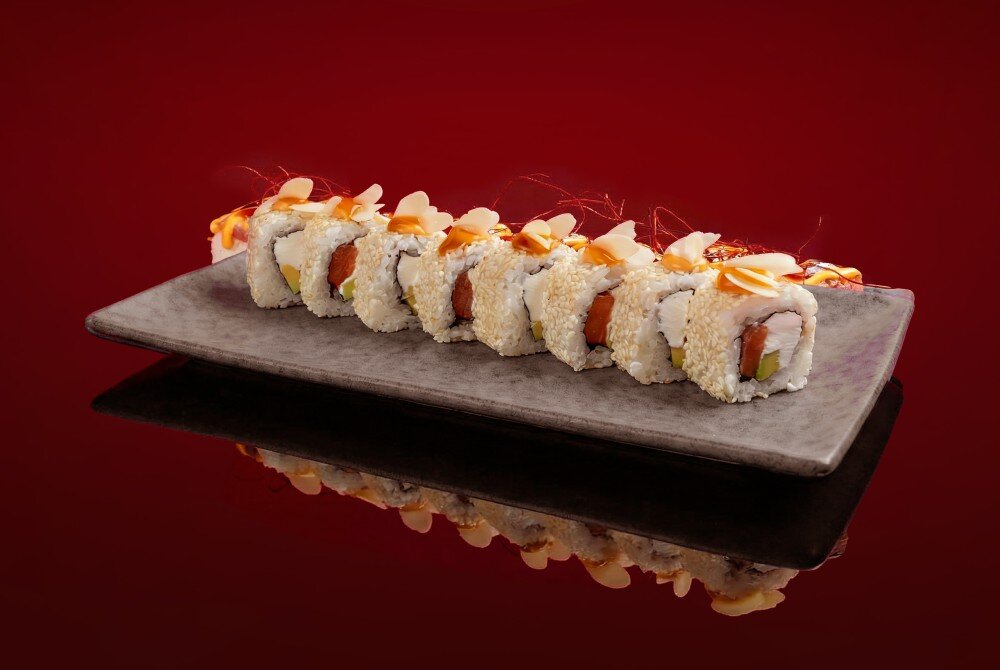 Рис для суши, лосось, авокадо, кунжут светлый, соус спайси, соус манго-чили, сыр cremette, хлопья миндаля, микрозелень