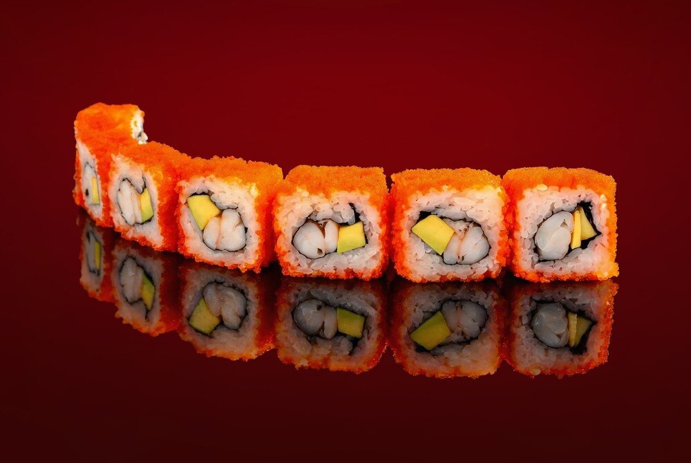 Рис для суши, майонез японский, тигровая креветка, авокадо, икра тобико оранжевая, микрозелень