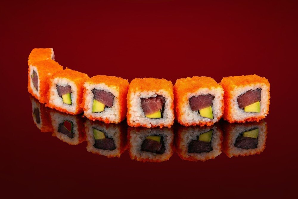 Рис для суши, майонез японский, тунец, авокадо, икра тобико оранжевая, микрозелень