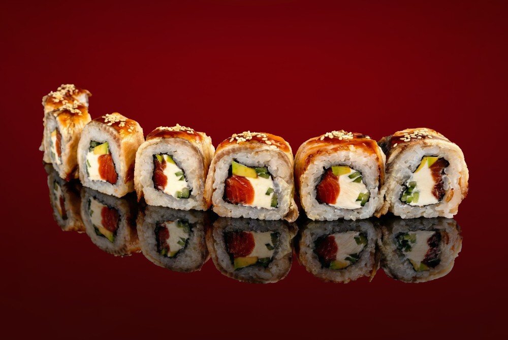 Рис для суши, сыр cremette, лосось, огурец, авокадо, угорь копченый, унаги-соус, семена кунжута белые, микрозелень