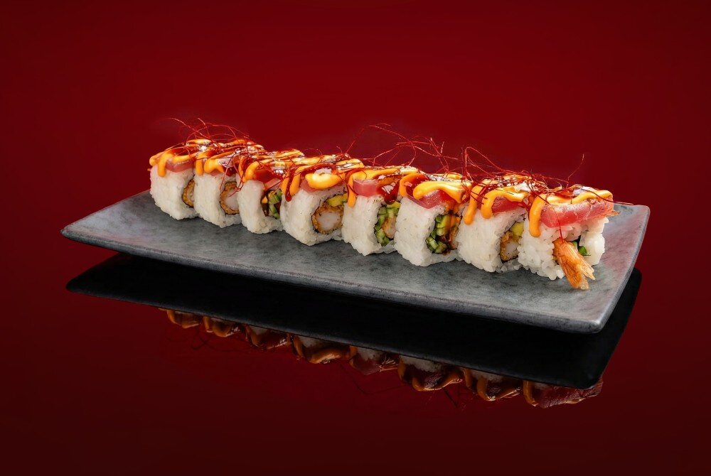 Рис для суши, тигровая креветка в кляре, огурец, авокадо, тунец, соус манго-чили, соус спайси, соус унаги, перец наиру нить, серебро сусальное, микрозелень