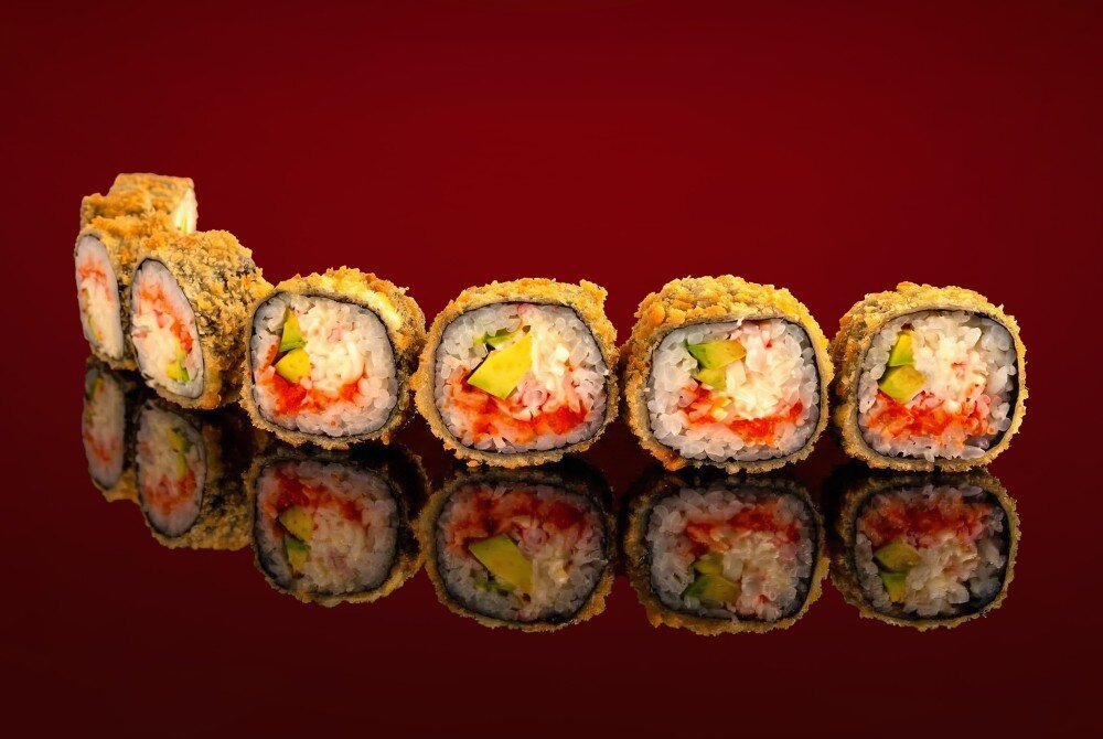 Рис для суши, майонез японский, икра тобико оранжевая, краб камчатский, авокадо, сухари панировочные Панко