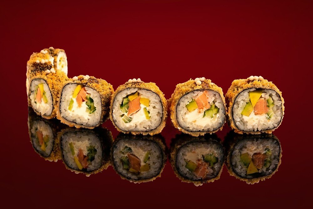 Рис для суши, сыр cremette, лосось, огурец, авокадо, унаги-соус, сухари панировочные Панко, рисовые шарики