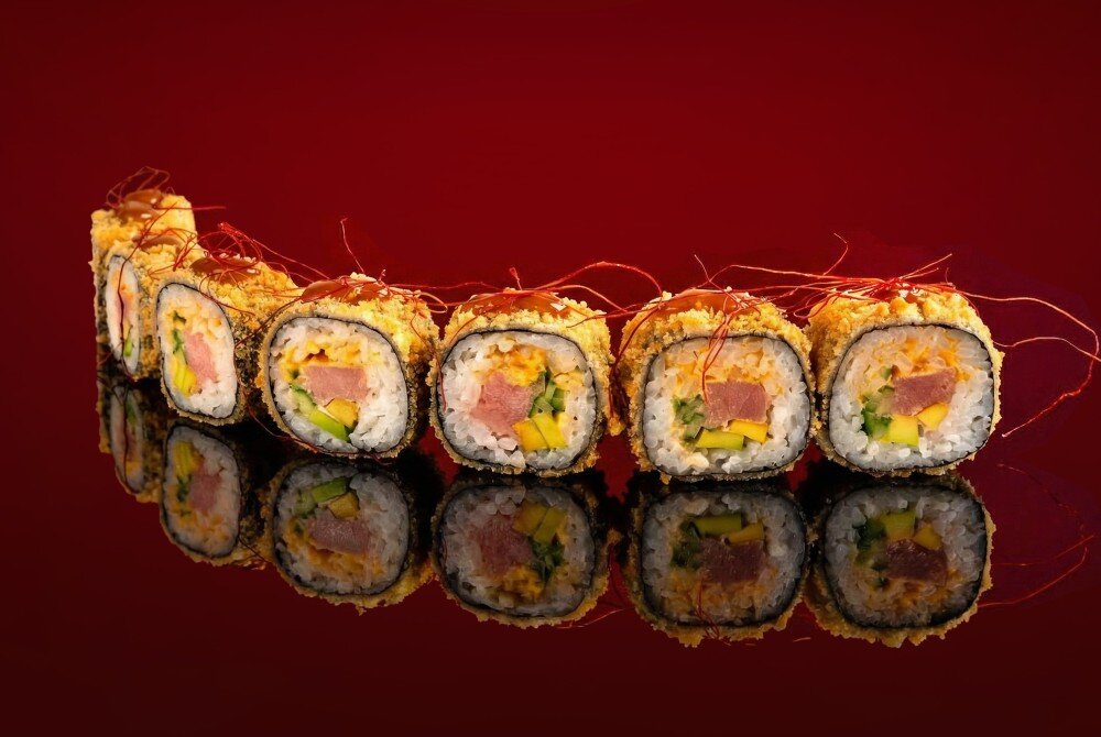 Рис для суши, соус спайси, тунец, огурец, авокадо, соус чили-ананас, перец наиру нить, панировочные сухари Панко