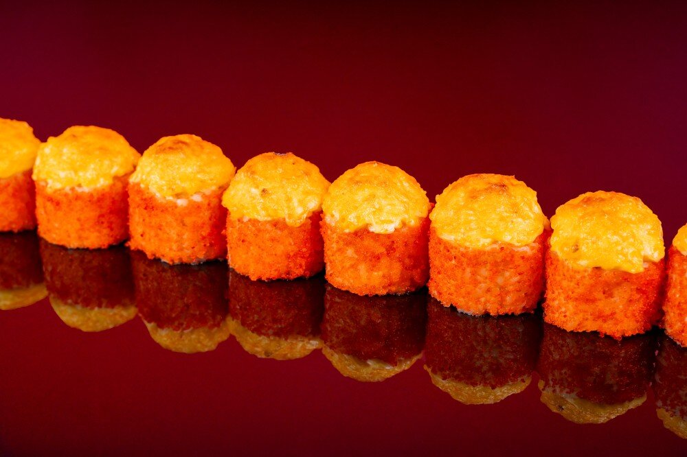 Рис для суши, лосось, огурцы, авокадо, икра тобико, соус для запекания от Шефа, трюфельный крем