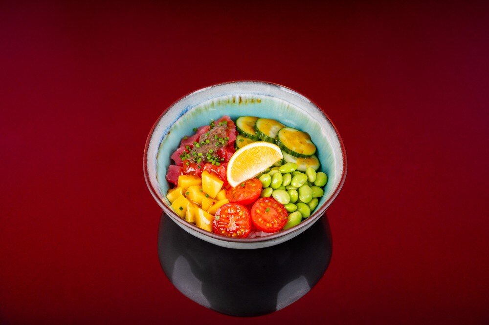 Рис, тунец, бобы эдамамэ, огурцы, черри, манго, соус чили манго, трюфельный крем, лук сибулет, лимон