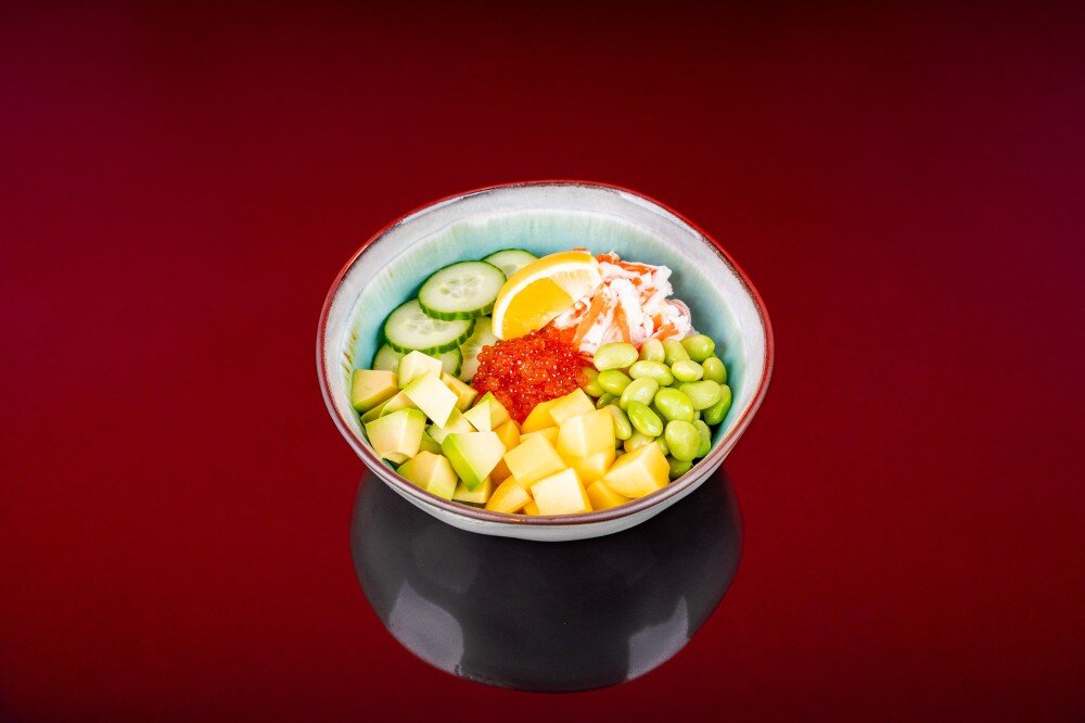 Рис, краб камчатский, авокадо, манго, бобы эдамамэ, огурцы, икра форели, сусальное золото
